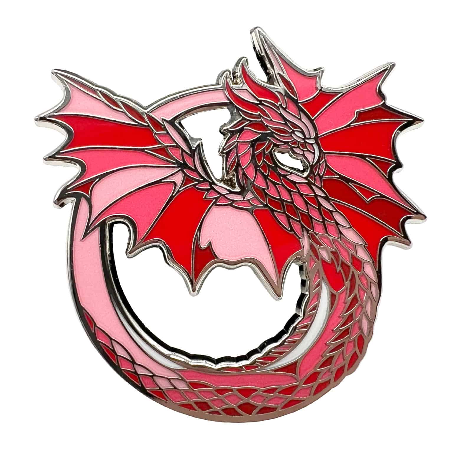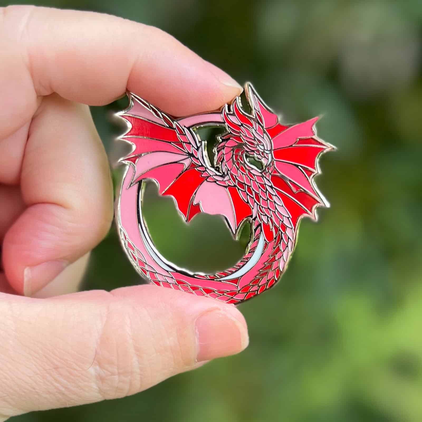One of my series of six hard enamel Rainbow Dragon pins, Crimson is decked out in several shades of rich red.