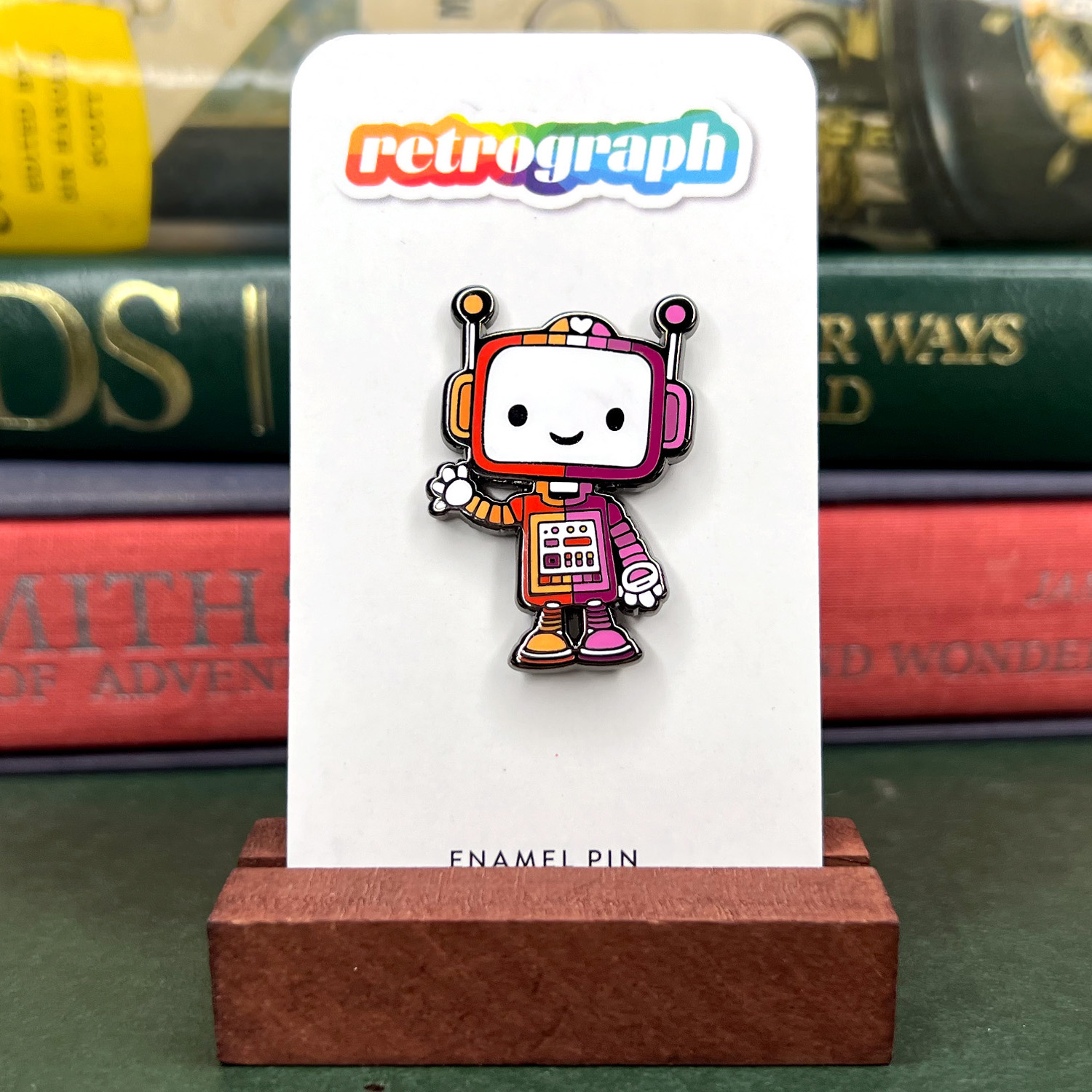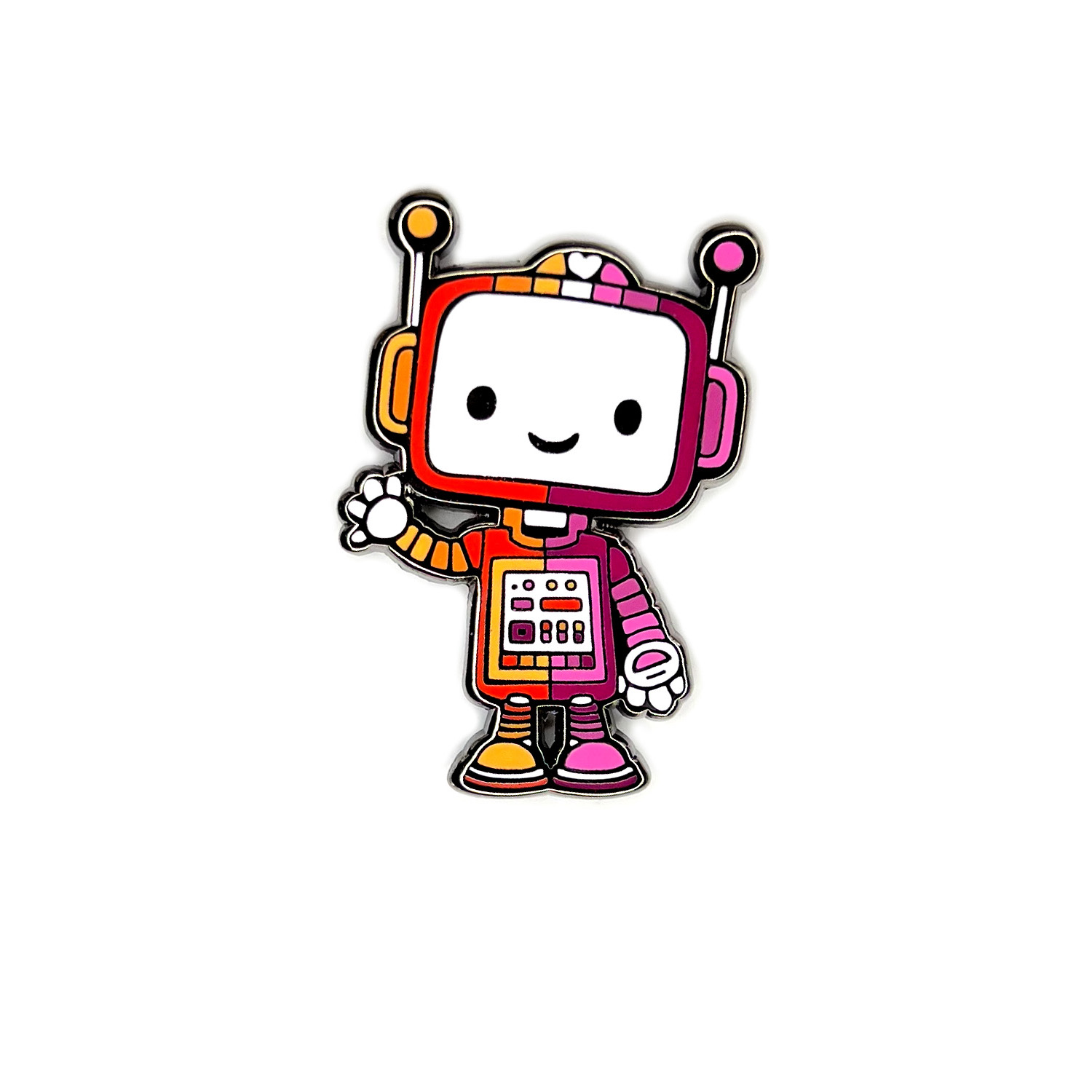 One of my series of seven hand-illustrated, hard enamel retro robot pins, the Lesbian Pridebot is decked out in the colors of the Lesbian Pride flag.